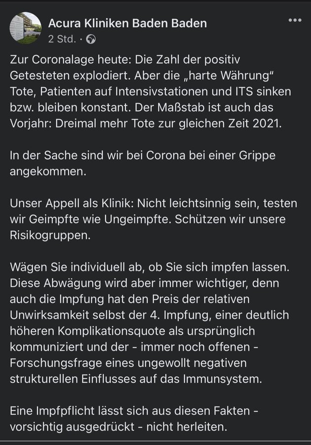 Wenn man erst einmal begriffen / realisiert hat, dass es schlichtweg eine seit Jahrzehnten am Leben erhaltene Wissenschaftslüge ist, Atemwegsinfekte (Grippeimpfung ex equo) mittels Impfung in den Oberarm präventiv bekämpfen zu können, weiß man, dass es reinste Zeitverschwendung ist, mühsam aufbereitete Graphiken über vermeintliche Impfeffektivitäten zum Thema Covid-19 resp. Spitalsbelegungen nachvollziehen zu wollen.