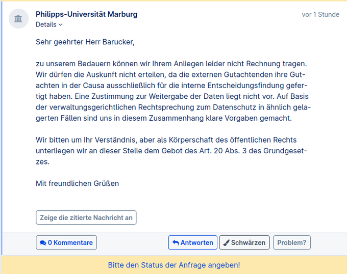 "Wir dürfen die Auskunft nicht erteilen, da die externen Gutachtenden ihre Gutachten in der Causa ausschließlich für die interne Entscheidungsfindung gefertigt haben." https://fragdenstaat.de/anfrage/honorarprofessur-eckart-von-hirschhausen/#nachricht-807441